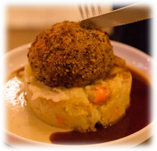 Boulets liégeois (oignons, viande de porc et veau, sauce au sirop de liège et à la bière brune), servi avec un stoemp de carotte