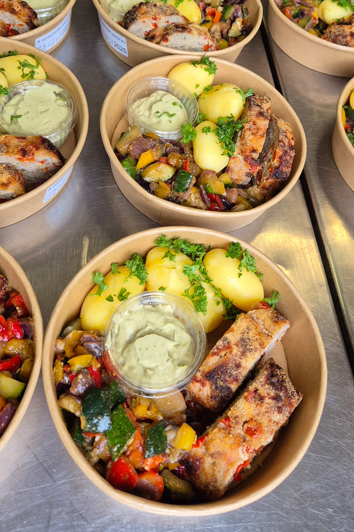 Pain de viande à l'italienne (haché porc et veau, poivrons, parmesan, pesto), accompagné d'une mayonnaise au pesto.